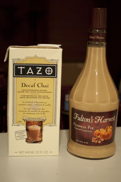 Other than the milk that's not shown in the picture above... I used Tazo® Decaf Chai Tea Concentrate and Fulton's Harvest Pumpkin Pie Cream Liqueur, which I found at Twin Liquors and spotted it at Spec's this evening as well. It's seasonal, so get it while you can! I'm sure a nice Pumpkin Spice Liqueur would do just as well.